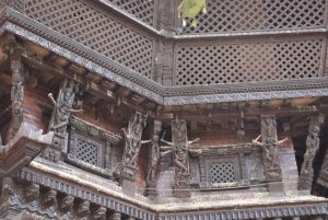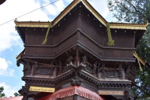 The temple showcases the classic features of Nepali pagoda architecture, with its tiered roof adorned with ornate carvings and vibrant colors. The roof’s upward curve symbolizes the ascent toward spiritual enlightenment.